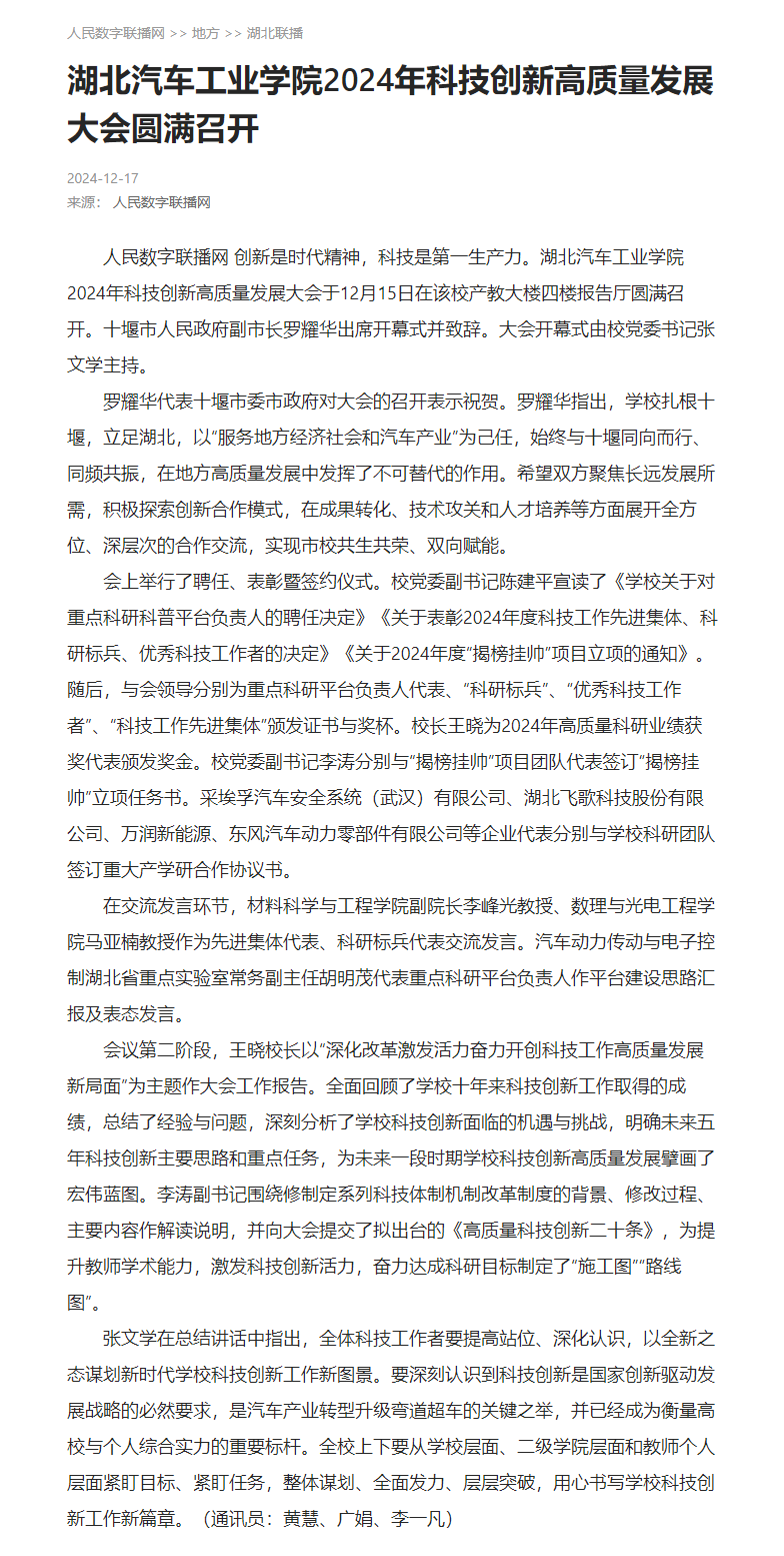 【人民数字联播网】湖北汽车工业学院2024年科技创新高质量发展大会圆满召开