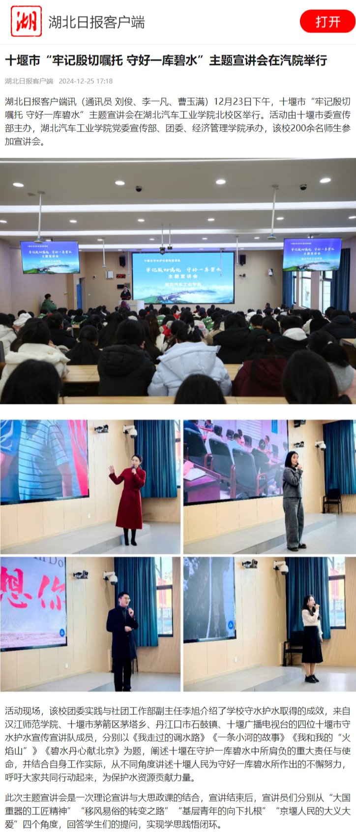 【湖北日报】十堰市“牢记殷切嘱托 守好一库碧水”主题宣讲会在汽院举行