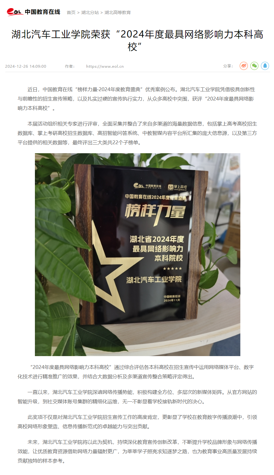 【中国教育在线】湖北汽车工业学院荣获“2024年度最具网络影响力本科高校”
