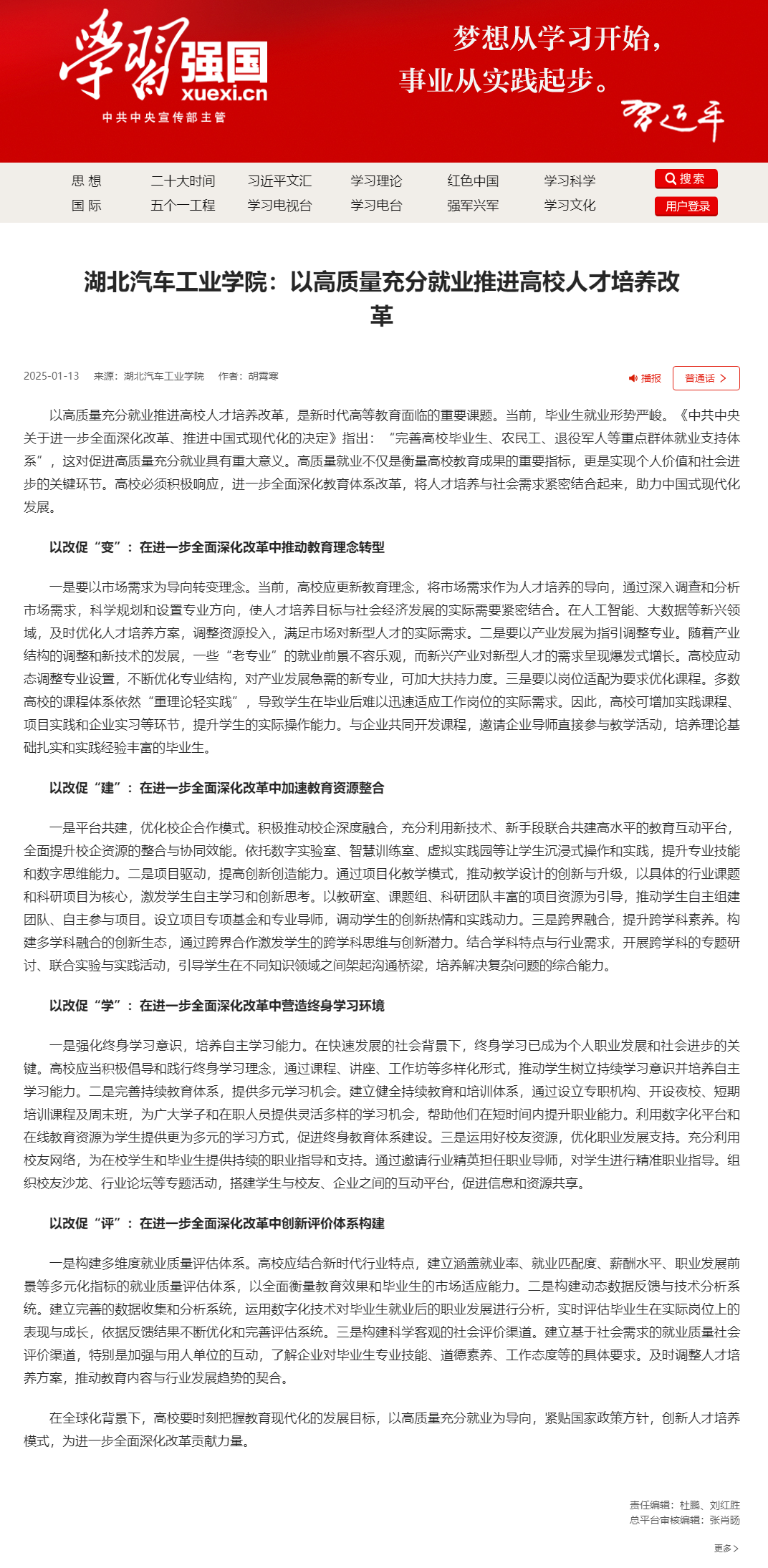 【学习强国总平台】湖北汽车工业学院:以高质量充分就业推进高校人才培养改革