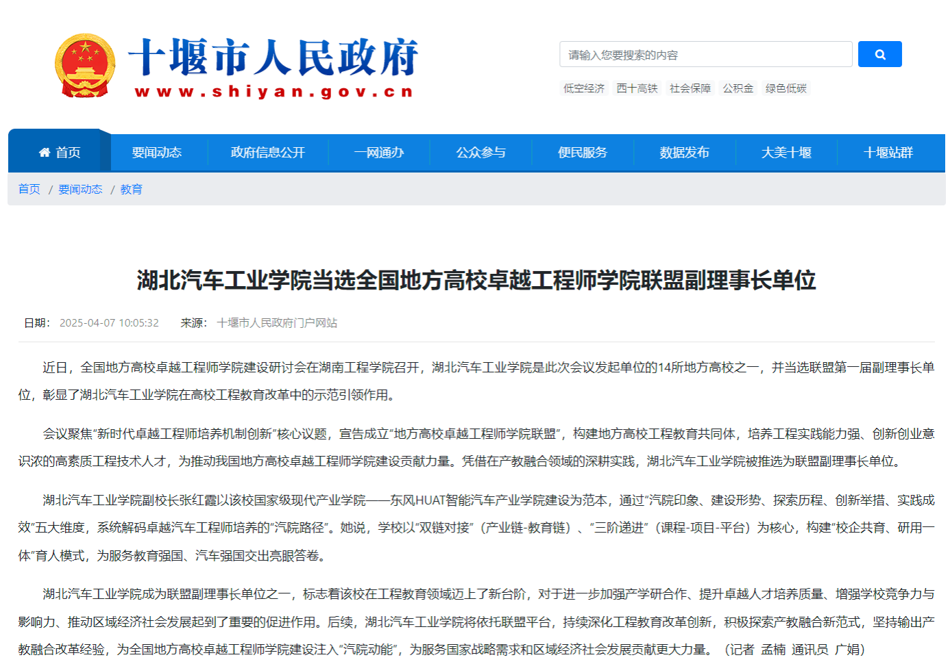 【十堰政府网】湖北汽车工业学院当选全国地方高校卓越工程师学院联盟副理事长单位