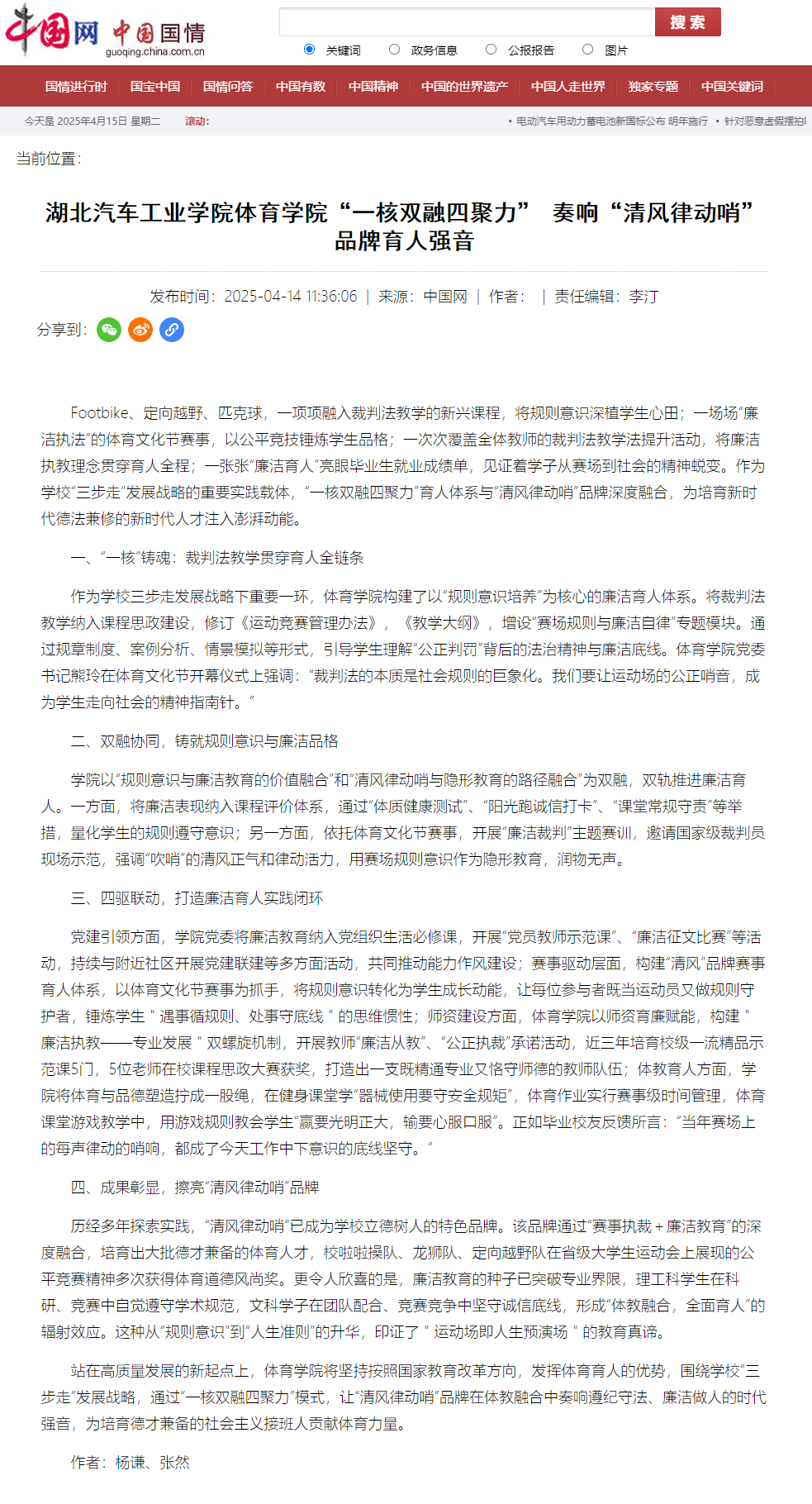 【中国网】湖北汽车工业学院体育学院“一核双融四聚力” 奏响“清风律动哨”品牌育人强音