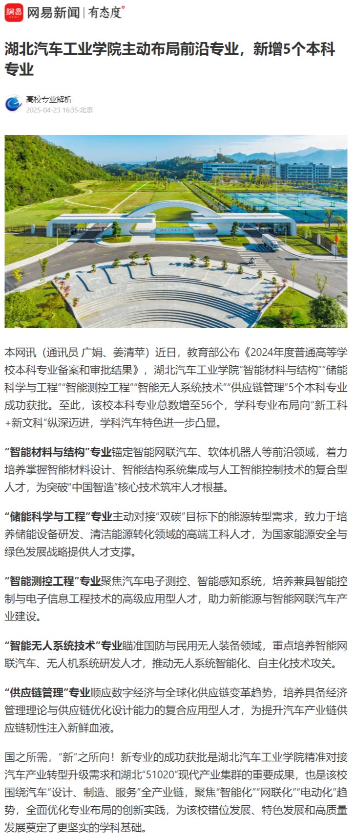 【网易】湖北汽车工业学院主动布局前沿专业,新增5个本科专业