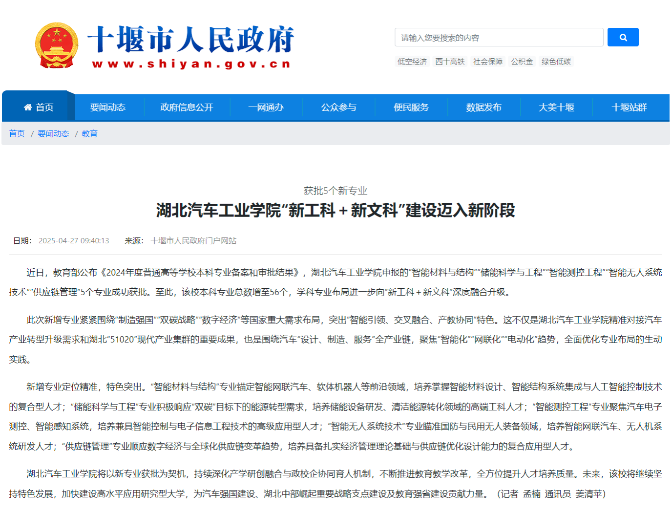 【十堰政府网】湖北汽车工业学院“新工科+新文科”建设迈入新阶段,获批5个新专业