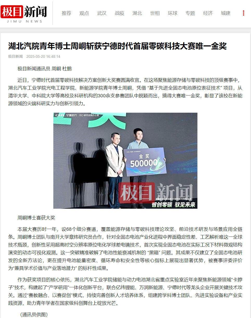 【极目新闻】湖北汽院青年博士周峒斩获宁德时代首届零碳科技大赛唯一金奖