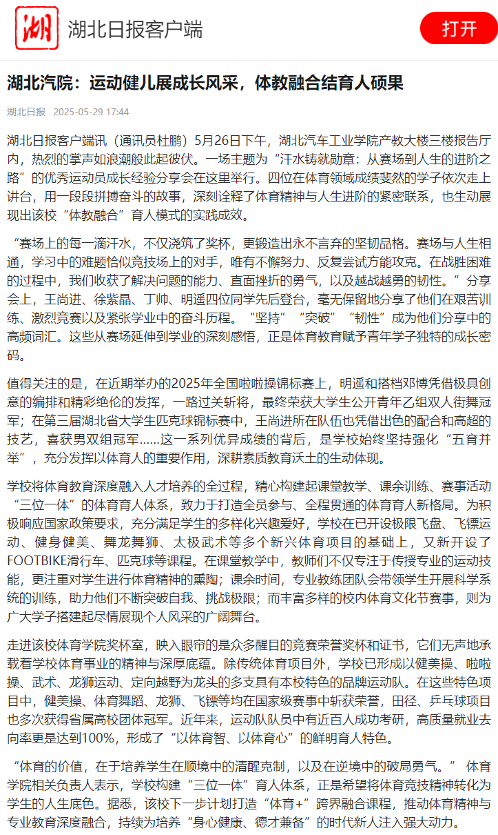 【湖北日报】湖北汽院:运动健儿展成长风采,体教融合结育人硕果