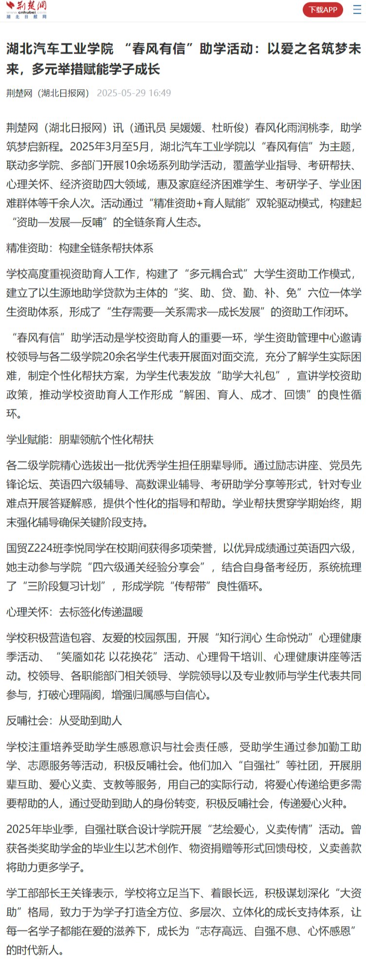 【荆楚网】湖北汽车工业学院 “春风有信”助学活动:以爱之名筑梦未来,多元举措赋能学子成长