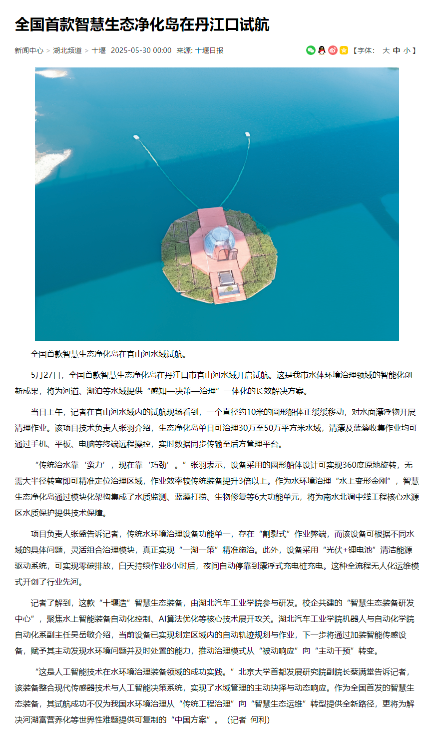 【长江网】全国首款智慧生态净化岛在丹江口试航