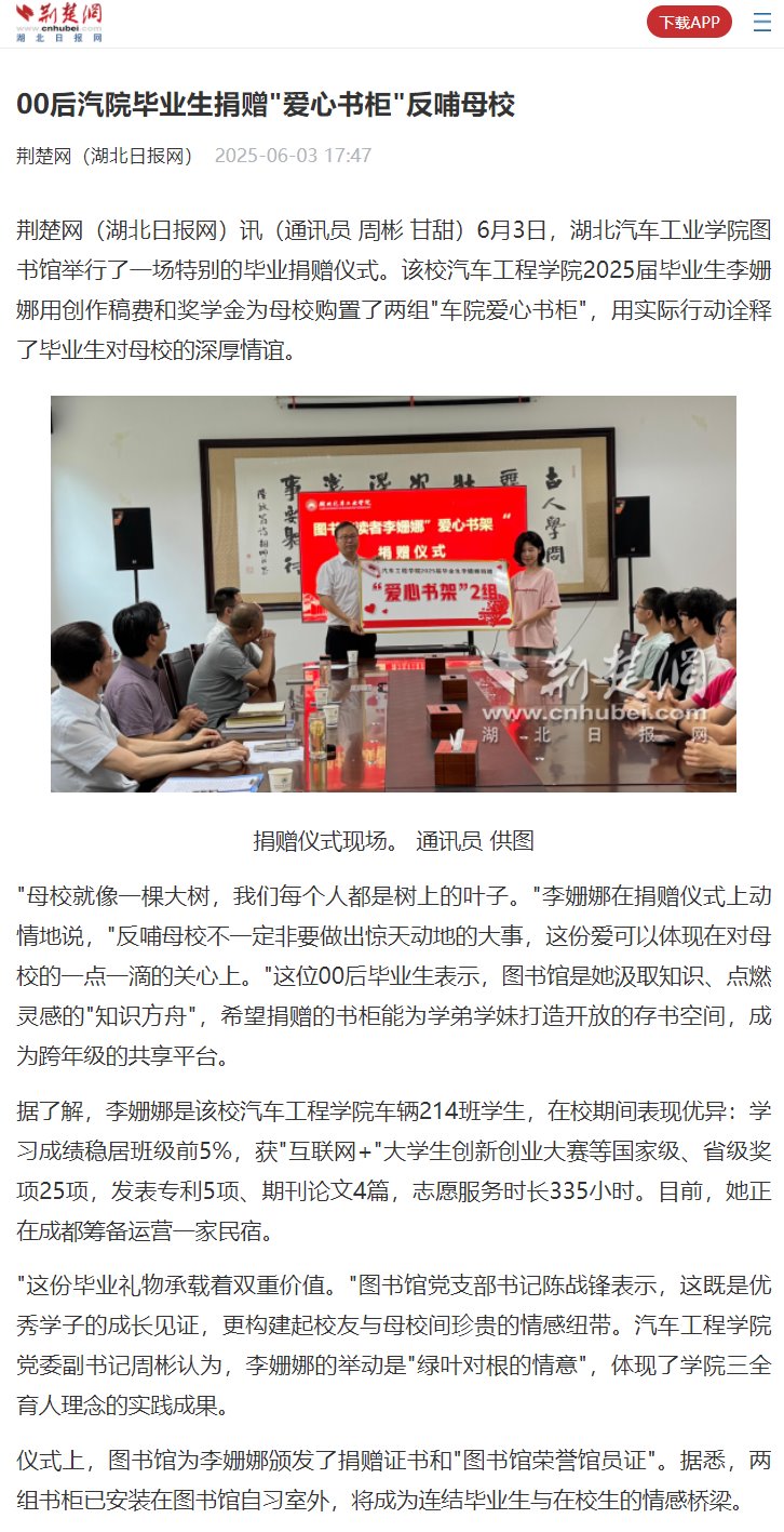 【荆楚网】00后汽院毕业生捐赠"爱心书柜"反哺母校