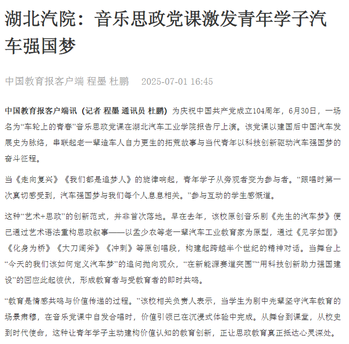 【中国教育报】湖北汽院:音乐思政党课激发青年学子汽车强国梦