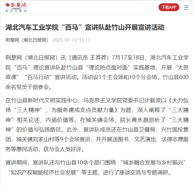 【荆楚网】湖北汽车工业学院“百马”宣讲队赴竹山开展宣讲活动