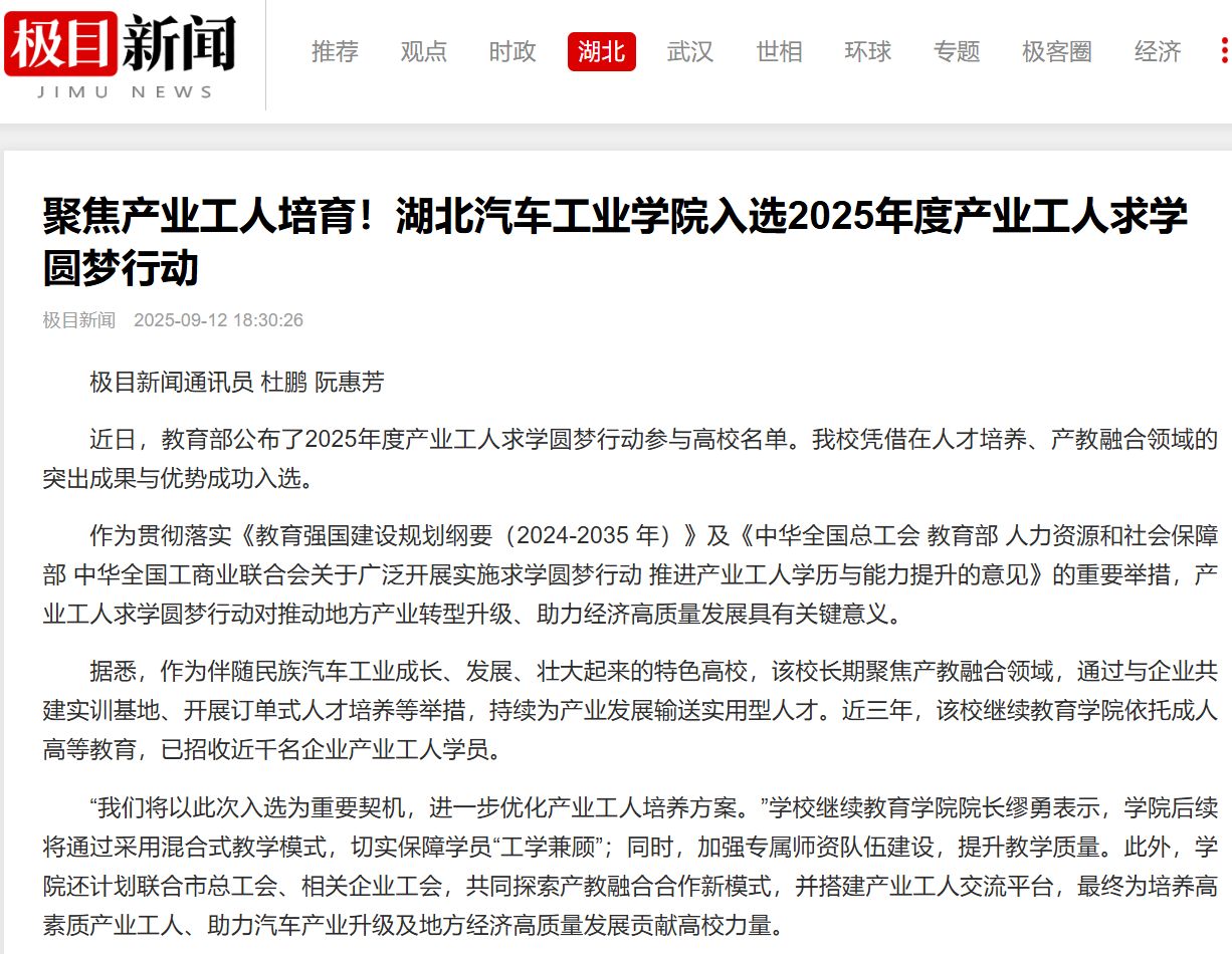 【极目新闻】聚焦产业工人培育!湖北汽车工业学院入选2025年度产业工人求学圆梦行动