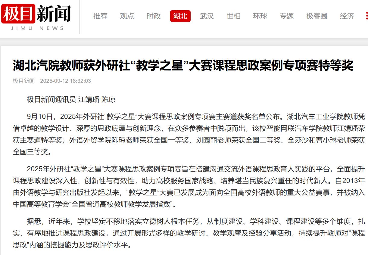 【极目新闻】湖北汽院教师获外研社“教学之星”大赛课程思政案例专项赛特等奖