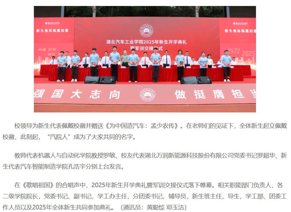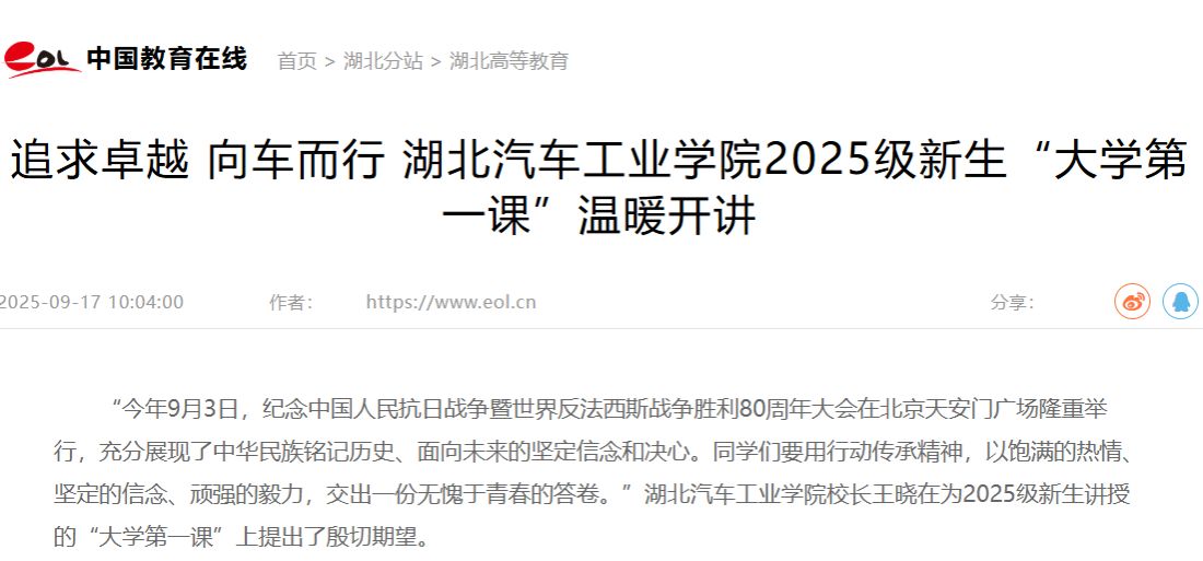 【中国教育在线】追求卓越 向车而行 湖北汽车工业学院2025级新生“大学第一课”温暖开讲