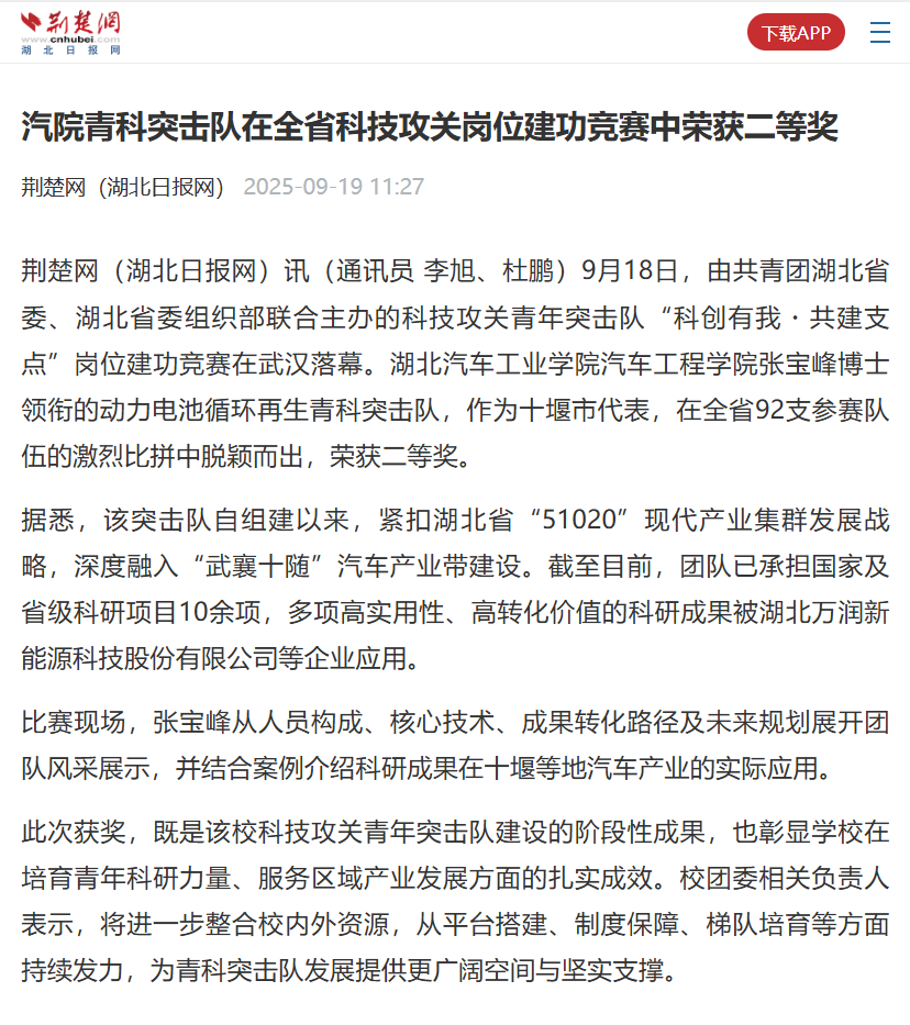 【荆楚网】汽院青科突击队在全省科技攻关岗位建功竞赛中荣获二等奖