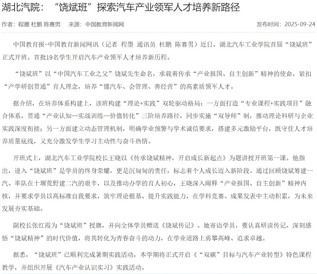 【中国教育新闻网】湖北汽院:“饶斌班”探索汽车产业领军人才培养新路径