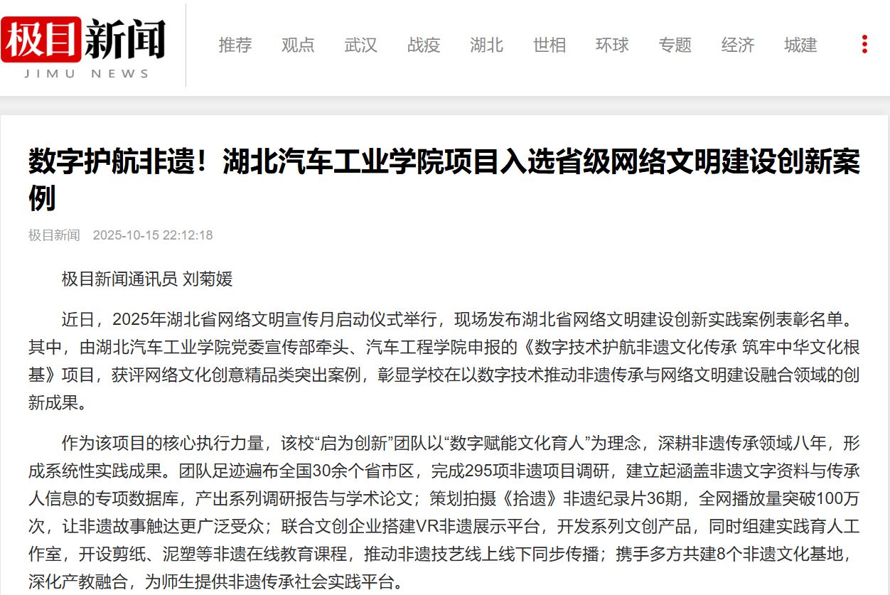 【极目新闻】数字护航非遗!湖北汽车工业学院项目入选省级网络文明建设创新案例