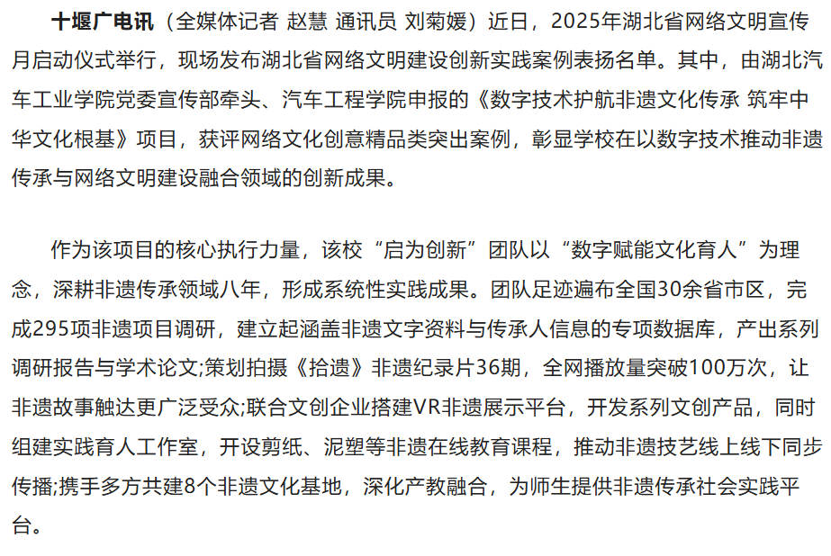 【十堰广电】数字护航非遗!湖北汽车工业学院项目入选省级网络文明建设创新案例
