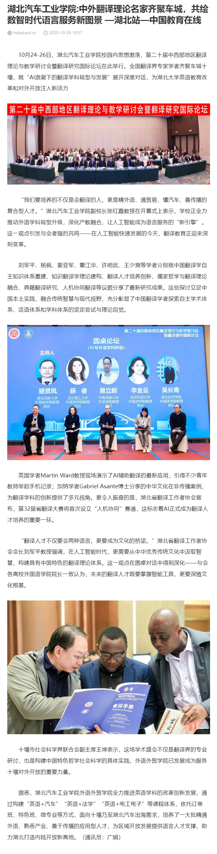 【中国教育在线】湖北汽车工业学院:中外翻译理论名家齐聚车城,共绘数智时代语言服务新图景 —湖北站